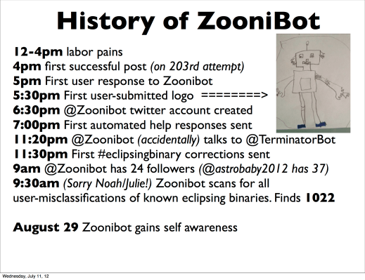 Zoonibot was conceived as a sort-of “Planet Hunters butler,” for Talk able and ready to automatically answer questions and provide detail when users request information. It all started at the .Astronomy 4 conference in Heidelberg after just a few hours of planning, and after spending the rest of the day (and night!) writing code, Zoonibot could perform 2 functions! 1) He is able to respond to users who request help by commenting with a #help hashtag and 2) he can cross-reference sources flagged as “transit” or “planet” to see if they are actually known eclipsing binaries.