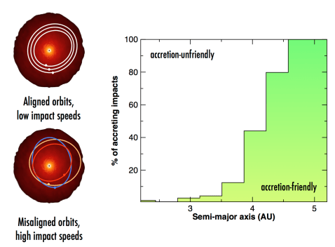 Binary systems represent a stringent test for planet formation theories, since the environment can be highly disturbed by the presence of multiple stellar components. Computer simulations show that the planetesimal stage is the most vulnerable to disruption, becoming a “bottleneck”. This bottleneck is primarily caused by the interplay between the gravitational perturbations of the binary (which raise the eccentricities of planetesimals) and the aerodynamic drag from a protoplanetary gas disk (which acts to misalign the planetesimal orbits). The latter misalignment raises the velocities at which planetesimals collide, such that instead of growing into larger objects, they get destroyed. The reason why the alignment of the orbits is crucial is easy to understand: imagine the collision between two cars on two contiguous lanes, versus that of two cars colliding at an angle. The latter collision will be much more violent, as there will be an additional velocity component perpendicular to the motion of either cars. The end result is that, in the simplest models, planet formation can only proceed far enough from the central binary (in the case of Kepler-16, outside 4 AUs).