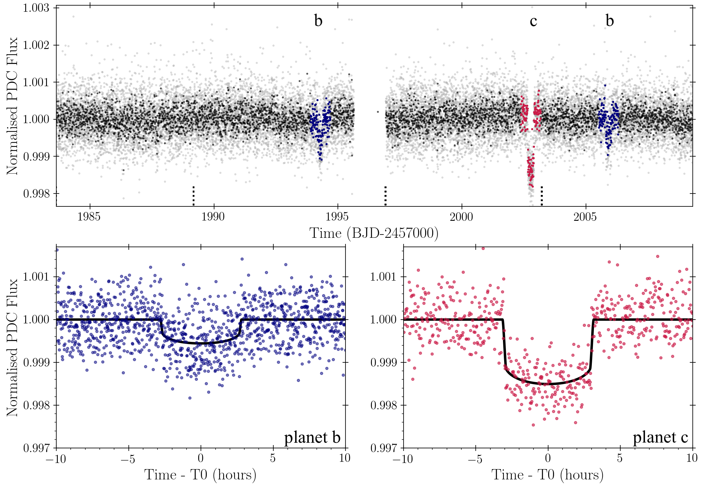 Figure 2: TESS lightcurve showing the transits of planet b in blue and the single transit of planet c in pink.