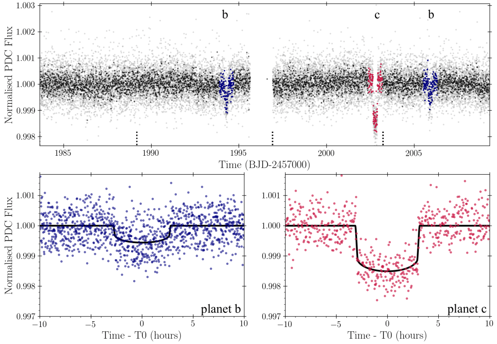The target was observed in Sector 25 of the TESS data only and the light curve displayed three transit events belonging to the two different planets (see Figure 2). These events were flagged on the talk discussion forums and brought to the attention of the PHT science team. Once it was flagged, we ran a large number of vetting tests to validate it as a planet. First, we made sure that the signal wasn’t caused by a jolt in the TESS satellite or a background event. Next, we ruled out ‘astrophysical’ false positives – signals caused by other astrophysical phenomena such as two stars orbiting around one another, known as an eclipsing binary.