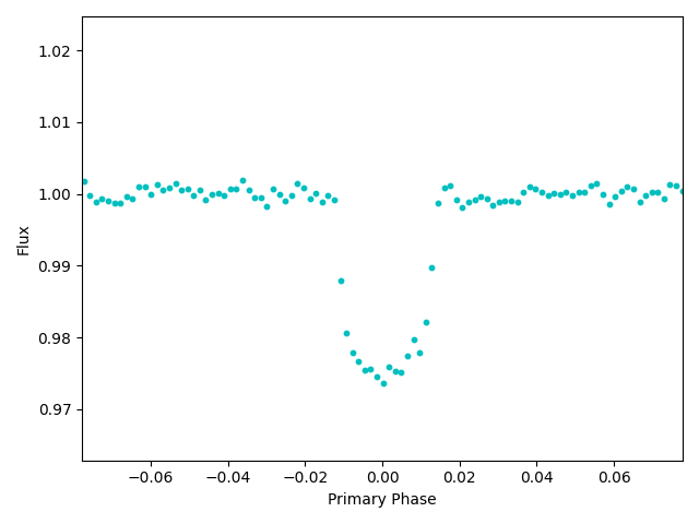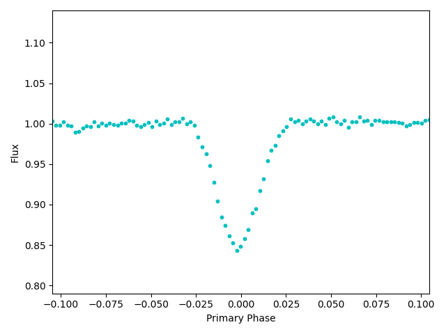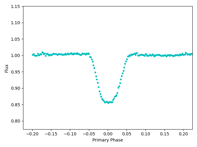 The angled sides are more pronounced in Figure 1, but don’t be fooled by dips with a curved base like Figure 3 below! If the transit has angled sides then it’s still a V-shape! The curved base of the transit is caused by a phenomenon called ‘limb darkening,’ where the central disk of a star appears brighter than the edge. The eclipsing star in this system is not just grazing the limb of the target star either, which is why the minimum flux of the transit is sustained for a range of phases.