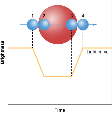 Figure 2: Diagram of the positions of an object eclipsing a star and the resulting light curve (brightness = flux). [Ref]