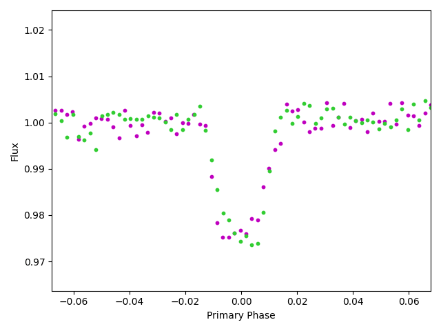 • ‘odd_even’ is for subjects in the Odd Even Transit Check. These plots show the odd (1st, 3rd, 5th, etc.) transits in green and the even (2nd, 4th, 6th, etc.) transits in magenta. If the depths of the odd and even transits don’t match then that’s a clear indicator that we’re looking at an eclipsing binary rather than an exoplanet transit. See Figure 6 below for the Odd/Even image corresponding to the subject shown in Figure 1.