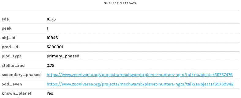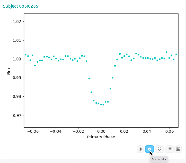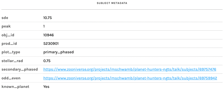 On Planet Hunters NGTS, once you classify a subject you can choose ‘Done’ to move to the next subject and keep classifying, or you can choose ‘Done & Talk’ if you want to start a discussion with the Planet Hunters community about anything interesting you may have found. When you are looking at a subject image in the Talk discussion boards, you’ll be able to access the subject metadata by clicking the ‘i in a circle’ button. This metadata is additional info about the subject, some of which will be interesting to Zooniverse users wanting to delve deeper into their classifications.
