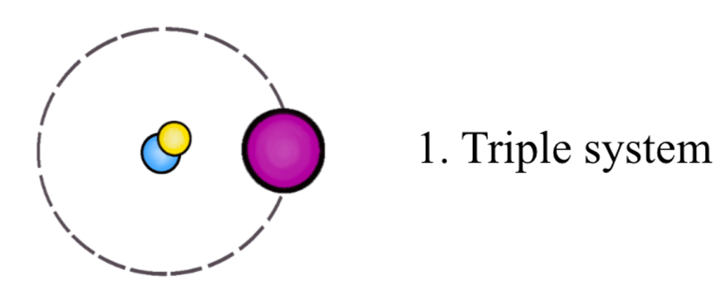 The future evolution of this system is equally interesting. Let’s look at what will happen to this system over the next couple millions of years. So this is where the system is now, two stars in an eclipsing binary with a third (more massive) star moving around it: