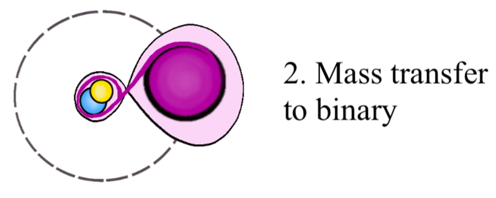 Now, as that outer star (purple one) continues to evolve its radius will expand, and it will likely expand in size so much that it will start to transfer mass over to the inner binary: