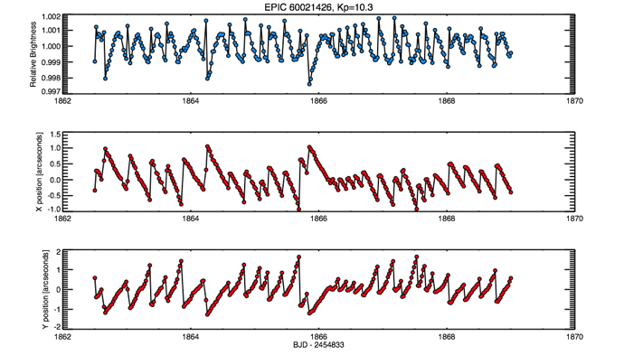 Measured brightness and image position versus time (Vanderburg & Johnson 2014). The jagged noise in K2 data is caused by the spacecraft’s jittery pointing.