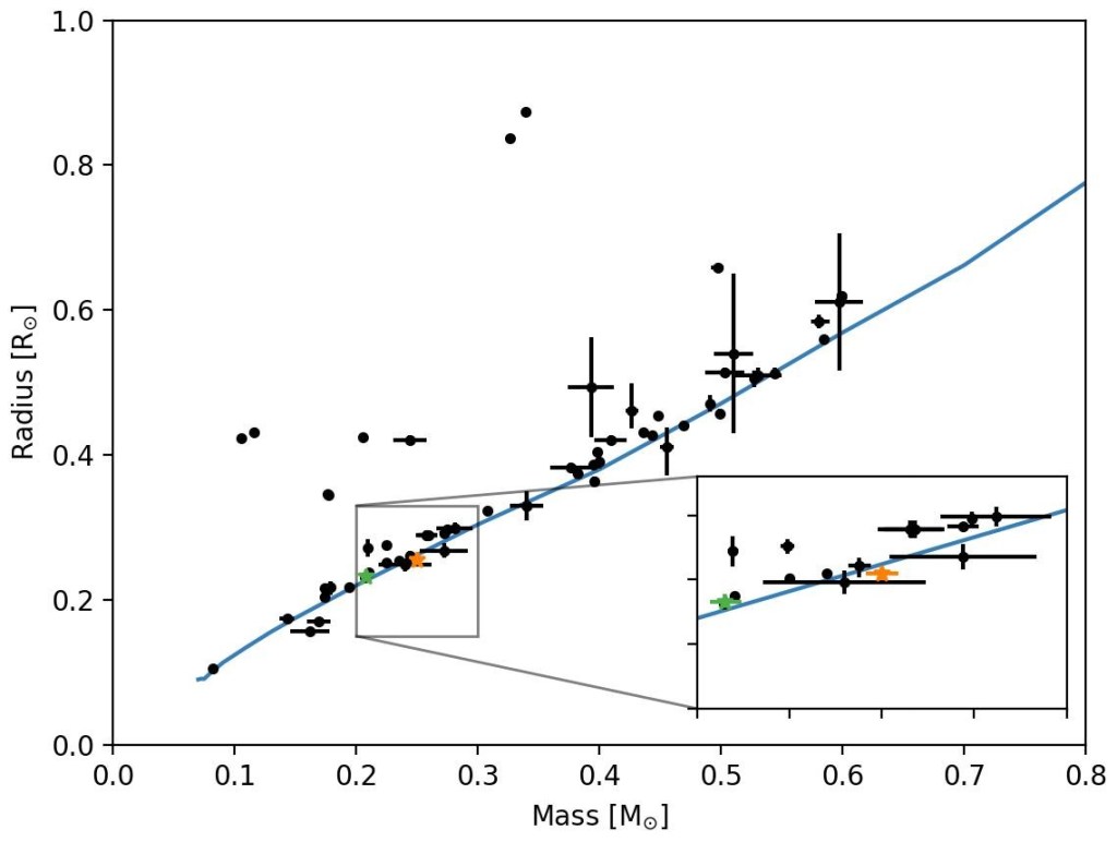 Equipped with our new knowledge of the correct orbital period, we were then able to model all the available data and derive measurements of the individual masses and radii of the two stars in the system. These are crucial measurements, as the mass and radius of a star allow us to compare it with other similar systems that have been discovered in the past and draw conclusions about whether the system follows theoretical predictions or deviates from what we expect! The image below shows different stars discovered in eclipsing binaries as black points and the theoretical mass-radius relation as a blue line (this is what theoretical modelling suggests should be the mass and radii of stars). The values on the axes are expressed in terms of solar units, meaning that our stars are approximately one quarter the radius of the Sun (~0.25 R⊙). The orange point shows the position of the primary star while the green point shows the position of the secondary star.
