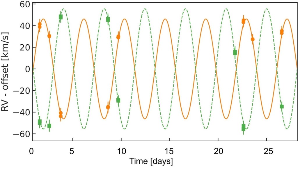 We took another look at the NIRPS observations with the knowledge that we were actually looking for two stars, and we were able to measure the radial velocities (RVs) across the whole month of observations for both stars. The image below shows these RVs in two different colors with the orange circles showing the velocity measurements for the larger of the two stars (the primary star) and the green squares showing the measurements for the smaller star (the secondary star). The lines show the best fit models to the data and these nice clear RV curves allow us to get a really good idea of the ratio of the masses of the two stars. The ratio of the masses is equal to 0.83, meaning the two stars are quite similar in mass (if they were equal they would have a mass ratio of 1, while a value closer to 0 would suggest they have very different masses).