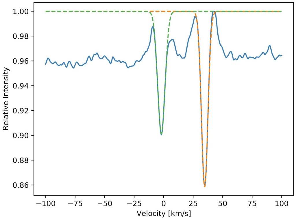 We’d already acquired speckle imaging observations (you can read more about what those are here) which told us that there probably wasn’t a nearby star that would give us a false impression of the transit depth. The next step was to get radial velocity observations. This technique works by detecting how much a star is “wobbling.” When we say the planets orbit the Sun, really we mean the planets AND the Sun orbit the entire Solar System’s common centre of mass, it just happens to be that this point is very close to the Sun since it’s so big. It’s the same story for exoplanets and stars orbiting one another, they all move around the system’s centre of mass. The wobbling that we detect from the host star is caused by any exoplanets or other stars that are orbiting it, and the amount of wobble relates to how much mass the object orbiting the host has. What this means is that if the star isn’t wobbling much, then it’s likely that the thing causing it to wobble is a planet, but if we see really large changes in the velocity of the star, or are even able to measure two different stellar signals, then we can determine that we are in fact seeing a binary star system, i.e. two stars orbiting one another!