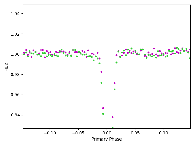 We were also able to determine that the orbital period (how often the stars go round each other) was actually double what we thought, meaning that they were orbiting one another every 4.2 days. This was an important discovery as this told us that what we had believed to be one object causing a transit every 2.1 days was actually two different eclipses! This is exactly the kind of thing the Odd/Even Transit Check is meant to spot, so why didn’t we? The plot on the left below shows the image that was classified in Planet Hunters NGTS and unfortunately the bottom of the transit was cut-off! This was because the algorithm that initially detects the transit signals underestimated the depth so then when the diagnostic plot was created it didn’t show the full extent of the transit. The plot on the right shows the odd/even for the full depth of the transit, which we were able to use to take a closer look at the data, and even here the difference between the depths of the green and magenta points is so subtle that it wasn’t enough to conclusively determine that this was in fact an eclipsing binary.